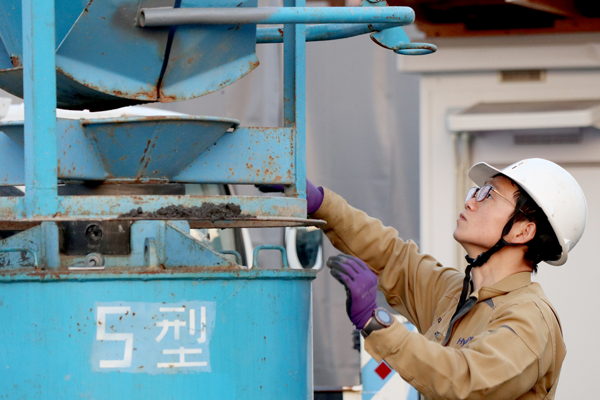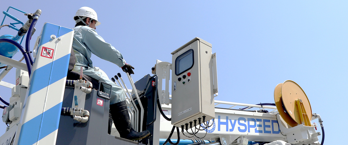 自社開発の地盤改良、ハイスピード工法を施工する仕事です。地盤調査の結果、建物の重さを支えるだけの力が地盤にないと判断された場合にハイスピード工法による補強をご提案しています。主に建柱車という重機を操作する人、施工のサポートをする人の2人1組で行います。